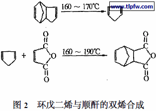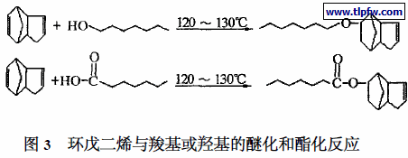 不饱和聚酯的分子量大、自由基反应聚合的活性低就需要用大量的苯乙烯来稀释和交联,降低不饱和聚酯的分子量和减少苯乙烯对交联固化的作用是减少苯乙烯含量的另一个重要方法。采用双键活性较高的单体替代部分双键活性低的MA 单体合成不饱和聚酯,提高其与苯乙烯的竞聚率和自聚交联固化的能力,就可以减少苯乙烯的含量。目前常用的替代MA 的不饱和酸酐有四氢苯酐、甲基四氢苯酐、富马酸、Carbic 酐(桥内亚甲基2四氢邻苯二酸酐) 等。还可采用丙烯酸、甲基丙烯酸、甲基丙烯酸缩水甘油酯、三羟甲基丙烷二烯丙基醚、甘油单烯丙基醚、一缩二丙二醇单烯丙基醚、9 , 11 -十八碳二烯酸、油酸和亚油酸等不饱和封端剂来封端, 增加不饱和聚酯的不饱和度以及交联的活性[19 ]。用潜伏性开环聚合交联替代部分自由基聚合交联也可以减少苯乙烯的用量。但比较简单的方法是用双环戊二烯改性不饱和聚酯[20 ~24 ]。双环戊二烯改性不饱和聚酯不但采用通用的聚酯设备,而且生产工艺简单灵活。可先与顺酸反应,也可与顺酐等其它组分同时加入,在较高温度下双环戊二烯与顺酐及其酯化物发生Diels – Alder 双烯加成反应, 生成桥亚甲基四氢邻苯二甲酸酐或酯(如图2) 。也以在酯化反应中或后期滴加,在较低温度下双环戊二烯的一个双键与聚酯链中的羧基或羟基发生加成反应而形成酯或醚(如图3) , 因此可以按需要控制分子量,为合成低粘度低苯乙烯含量高活性的不饱和聚酯绝缘漆创造了条件。双环戊二烯改性的不饱和聚酯还在表面气干性、耐热性、吸湿性、固化收缩率、机械性能、成本方面等都要优于未改性的不饱和聚酯。由于脂环的引入和苯乙烯含量的减少(苯环的减少) ,绝缘性能尤其是耐电弧性能也有所提高。