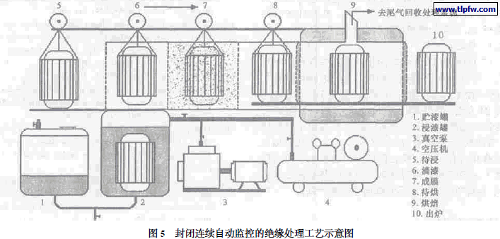 传统的绝缘处理工艺一般是浸漆→滴漆→烘焙,较长时间的滴漆和升温烘焙是苯乙烯挥发和漆流失的主要阶段。根据上述低温成膜高温固化的绝缘处理工艺原理,如果在滴漆与烘焙之间增加室温成膜的工艺和设备(如图4 所示) , 就可以缩短滴漆的时间, 大大减少苯乙烯的挥发和漆的流失,同时减少了苯乙烯的毒害,提高了绝缘处理的效率和绝缘的质量。目前我国的绝缘处理工艺的自动化连续化程度很低,微机控制的应用也只限于单元的工艺操作[25~27 ] ,敞开间歇的操作造成苯乙烯等有机和挥发份对工作环境污染和工人的毒害。发展封闭、连续自动、全程微机控制的绝缘处理工艺设备(如图5 所示) 是改善工作环境,提高绝缘处理质量可靠性的重要条件。