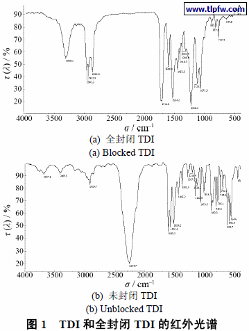 作为对比试样的TDI 红外光谱见图1b。对比图1a、b可知,TDI 的红外光谱图在2 270 cm−1 左右有─NCO 的特征峰,而经过封闭的TDI 没有─NCO 的特征峰,说明封闭反应确已发生,TDI 封闭完全。