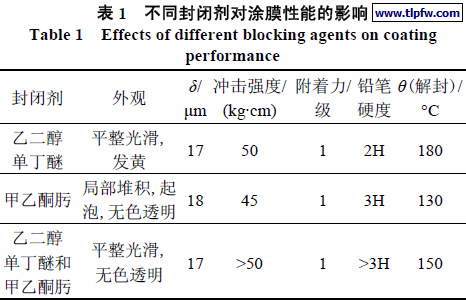 本实验分别采用乙二醇单丁醚、甲乙酮肟及其复配物对TDI 进行全封闭,考察了不同封闭剂对涂膜性能的影响,结果如表1 所示。可以看出,封闭剂乙二醇单丁醚的解封温度高,导致漆膜烘烤后发黄;甲乙酮肟解封温度相对较低,但是涂膜不均匀、局部堆积、起皮,这可能是因为甲乙酮肟反应活性较高,导致电极反应加快,电极上水解加剧,从而产生大量起泡,使漆膜出现浮起等现象。而同时采用这2 种封闭剂,漆膜各项性能良好。
