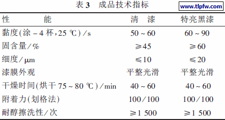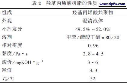 热固性丙烯酸漆的性能很大程度上取决于羟基丙烯酸树脂的性能。所用的丙烯酸羟值低、干燥固化速率快、附着性好、耐溶剂性、耐候性佳。具体指标如表2所列。
