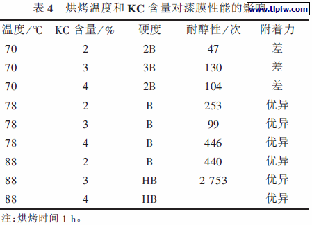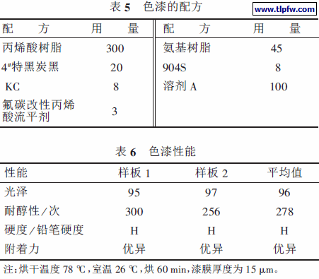 将丙烯酸树脂与氨基树脂按3:1的比例配制,加2%的固化促进剂KC,加人稀料B后,喷于ABS板上,70-80℃烘干,测其附着力、硬度、光泽等性能,结果如表4所列。