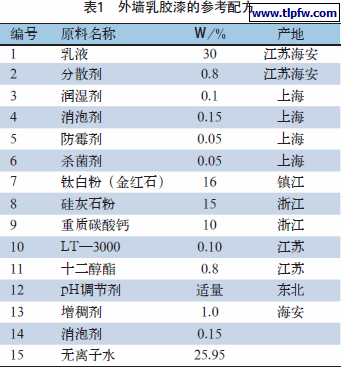 1 低温施工、环保节能外墙乳胶漆的参考配方(见表1、表2)
