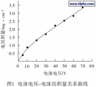 改变电泳电压,测定不同电压值(V)时样板上单位面积漆膜质量(W),见图1。