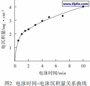 改变电泳时间,测定不同电泳时间(t)对漆膜质量(W)的影响,见图2。