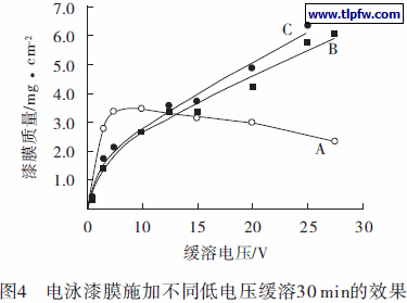 ②漆膜的质量,在采用30 ~ 70 V 的电泳电压时是符合要求的,外观呈Ⅰ~Ⅱ级状态。