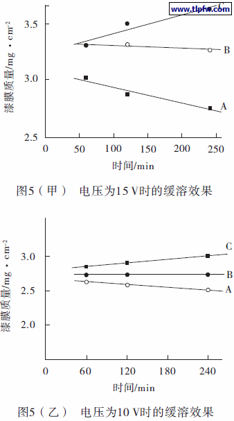 参比工艺条件下,泳出2 块样板,取1 块在漆浴中浸泡,且施加不同低电压,测出不同低电压下,浸泡不同工艺时间对漆膜质量的缓溶作用,见图5。