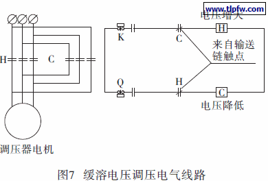 ⑶基于上述工艺结论,对流水自动电泳生产线的电气控制提出如下建议;当生产线按动运输“停止”按钮时,同时启动直流电源调压器的电动机,使调至低压(低电压处设限位开关)。当按动运输链“启动”按钮时,也同时接通调压器调压电动机,使调至高电压(高电压处设限位开关)。电气线路示意见图7。