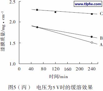 图5 甲、乙、丙分别显示电泳后样板在15 V、10V、5 V 时,漆膜质量的变化。直线A 为参比工艺条件下单位面积上漆膜质量;直线B 为特定的缓溶电压下,缓溶60 ~ 240 min后,样板单位面积上漆膜质量的变化;直线C 为直线B 的校正值线。