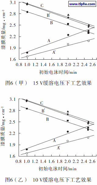 参比工艺条件下,样板不泳到工艺时间,就施以低电压缓溶,缓溶不同时间后,再在参比工艺条件下完成电泳,测定低电压在电泳工艺中的缓溶效果,见图6。直线A 和A′分别为参比工艺条件下,同一漆浴,电泳不同时间(1.0 ~ 2.5 min)后,样板单位面积上漆膜质量的变化。直线B 和B′分别为电泳不同时间(1.0 ~ 2.5 min)后,样板分别停止电泳30 min、60 min,并施加15 V缓溶电压,随后再继续电泳到3 min,样板单位面积上漆膜质量的变化。直线C 为B′的校正值线。