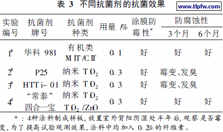 本实验选用HE- I乳液, 比较了常用的异噻唑啉酮类有机杀菌剂和几种不同的无机纳米抗菌剂的抗菌效果, 其中2#采用国外A 公司生产的纳米T iO2 (锐钛矿/金红石= 80/20), 3#为国内B 公司生产的锐钛型纳米TiO2, 4#采用江苏常泰纳米材料有限公司生产的复合纳米抗菌剂-"常泰"四合一宝, 试验结果见表3。