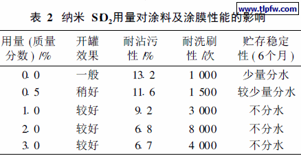 纳米级材料加入涂料中, 可极大地减少涂料中颜料和成膜基料之间的自由体积, 大大提高填充比, 改进涂层的机械强度, 提高涂膜的耐洗刷性, 增加涂层表面的致密性和平整度, 从而改善涂层的耐污性。此外, 纳米材料具有极大的比表面积和表面活性, 其加入涂料中, 与基料和溶剂或水形成强大的相互作用力, 可明显改善涂料的流变性和悬浮稳定性。本实验考察了纳米S iO2的加量对乳胶漆(选用HE – I乳液)稳定性和涂膜性能的影响, 结果见表2。
