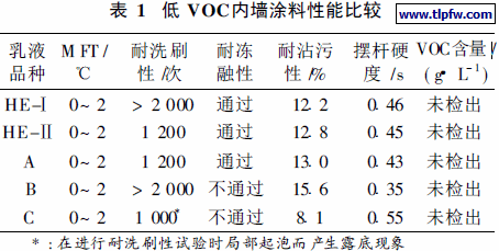 由表1可知, 丙烯酸酯乳液HE – I和HE – #及乳液A 均具有优异的低温成膜性, 由其制备的中PVC 的内墙涂料, 其涂膜具有良好的硬度和耐沾污性, 且涂料的冻融稳定性好, 因此可用于制备超低VOC或零VOC的内墙乳胶漆; 乳液B 尽管低温成膜性好, 但可能是其Tg 稍低的缘故, 其涂膜的硬度稍低些, 且涂料的冻融稳定性差, 不适合用于制备低或零VOC的内墙乳胶漆; 乳液C 可能是其Tg 太高的缘故, 其成膜温度稍高, 在配制乳胶涂料时还需加入一定量的成膜助剂, 才能使涂料满足低温条件下可施工的要求。由表1中各涂料的耐洗刷性试验结果可以看出, 不同的乳液其对颜填料的承载力不同, 表现在涂膜的耐洗刷性存在较大的差异。