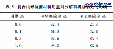 本实验还考察了∋常泰(复合纳米抗菌剂用量对催化分解空气中的有机物效果的影响, 结果见表5。