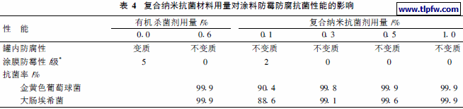 本试验考察了"常泰"复合纳米材料抗菌剂用量对内墙乳胶漆防霉防腐抗菌性能的影响, 结果如表4所示。从表4中数据可以看出, 在涂料中加入0.3% ~0.5% (质量分数)复合纳米抗菌材料, 涂料的防霉防腐抗菌功效等相当于有机杀菌防霉剂, 涂料的成本却增加不多, 不但能取代对人体有害的有机防腐抗菌剂, 而且还具有长效性。
