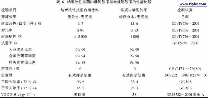 将纳米改性抗菌内墙乳胶漆与市售的常规内墙乳胶漆进行了性能比较, 结果见表6。