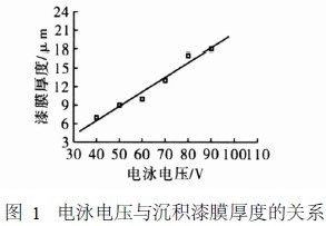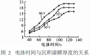 从图1可以看出,漆膜厚与电压基本呈现线性关系。电压过低,沉积速度慢,生产效率低,漆膜薄,难以达到应用要求。电压过高,漆膜沉积速度快,但易被击穿,造成外观粗糙和性能变差。试验证明,适合于本体系的电压为80 V。