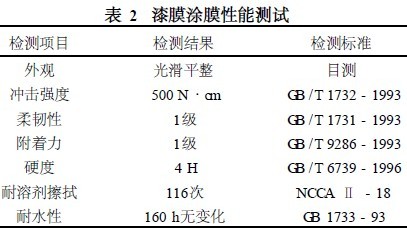 体系pH值采用上海天达仪器有限公司的PHS -3TC精密数显酸度计进行测定。冲击强度采用上海普申化工机械有限公司的QCJ -Ⅱ型漆膜冲击器测试。柔韧性采用中国天津材料试验机厂QTX -Ⅰ型漆膜弹性测定仪测定;附着力采用上海现代环境工程技术有限公司FZ-Ⅱ型漆膜附着力测定仪测试。