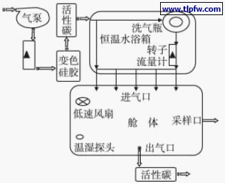 采用自行设计的小型环境测试舱[7],对放置样品后舱中VOCs 浓度进行监测: 参考GB /T18883 -2002《室内空气质量》,跟踪抽取小型环境测试舱中气体,利用热解吸气相色谱分析法检测气体中VOCs含量。该小型环境测试舱( 容积1 m × 1 m × 0. 6 m) 采用双层镜面不锈钢材料制作,内壁光滑无吸附作用。舱体开口处装备气密性良好的无吸附性封口,以便装入待测样品和进行清洗。舱体具备空气发生系统和温、湿度控制系统及采样系统,可以对舱内气流量及温、湿度进行控制,以满足试验要求( 图1) 。