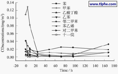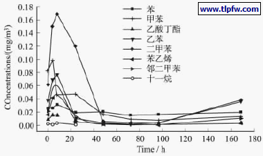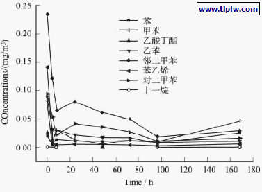 ( 2) 丙烯酸内墙乳胶漆中,VOCs 各组分的释放都呈一定的规律性。VOCs 各组分释放浓度在前期较短时间内急速上升至最大值,然后开始迅速衰减,经历一个相对缓慢的衰减过程后,最后趋于一个稳定值。