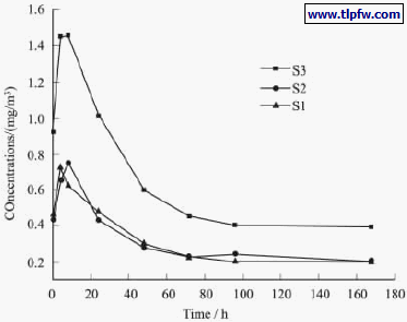 由图3 可见,样品S2 中最主要的VOCs 组分是甲苯,其他几种组分的浓度较低。在S2 中,各组分浓度衰减的速度较快,其峰值也在被测的3 种样品中属于最低。从污染物释放的角度来看,样品S2 在3 种涂料中表现最好。