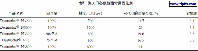 聚天门冬氨酸酯涂料,是通过- N C O与聚天门冬氨酸酯上的- N H反应,m(- N C O):m(- N H)=1.1:1时,由于聚天门冬氨酸酯中- N H的活泼氢恰好和异氰酸酯反应,涂膜能够形成内应力均匀的嵌段结构,内部分子链之间具有大量氢链效应,使涂膜具有优异的附着力、柔韧性、耐磨性、强度和硬度[2],常用的聚天门冬氨酸酯脂肪族固化剂见表5。