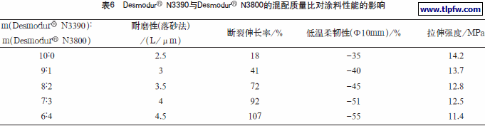 由表6可知,在Desmodur N3390与Desmodur N3800的混配比例中,随着D e s m o d u r N3800质量比的提高,涂膜的耐磨性、断裂伸长率、低温柔韧性相应提高,而拉伸强度呈小幅度降低。为了使涂膜保持优良的弹性、强度、耐磨性和低温柔韧性,选取m(D e s m o d u r N3390): m(Desmodur N3800)=8:2较好。