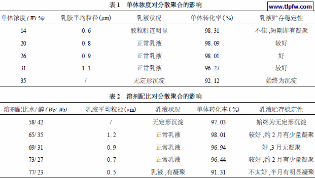 单体浓度会直接影响乳胶粒子大小、乳液的稳定性以及涂膜性能,单体浓度对分散聚合反应的影响如表1。