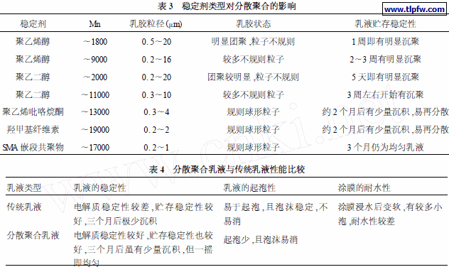 (3) 用分散聚合乳液配制的涂料,除贮存稳定性与传统乳液相近外,其电解质稳定性、起泡性和涂膜耐水性均明显优于传统乳液。