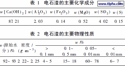 电石渣主要成分为Ca ( OH ) 2, 还含有硅、铁、铝、镁等金属的氧化物, 以及少量的硫化物、磷化物等杂质。电石渣外观呈灰白色, 有刺鼻异味, 颗粒较为均匀, 非常细微, 易包裹水分, 含水量通常较大, 未经脱水处理的电石渣含水量高达80% (质量分数) ,常呈膏状。电石渣的主要化学成分和物理性质分别见表1和表2[ 2 ] 。
