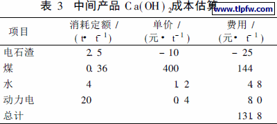 小试在某PVC 厂配套建立一套内墙涂料的生产装置上进行。中间产品成本见表3。从表3可以看出, 原料成本为131. 8元/ ,t 其他成本按原料成本的30% 计, 则中间产品C a( OH ) 2成本为131. 8 +