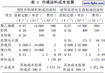表4为内墙涂料成本估算。从表4 可见, 使用处理好的电石渣制成的涂料成本为1 472. 94元/ ,t比使用外购填料制成的涂料成本降低60. 4元/ ,t 根据市场行情, 假设内墙涂料的售价为2 000元/ ,t 利润约为527元/ ,t 则比使用外购填料制成的涂料利润增加60. 4元/ t。若在PVC 厂配套建一套10万t /a内墙涂料的生产装置, 则每年可处理电石渣近10万,t 同时实现经济效益5 270万元。因此, 用电石渣代替灰钙粉作内墙涂料的填料具有环保和经济双重效益。