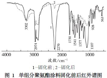 由图1可知,固化前, 3302 cm- 1为—NH的特征吸收峰; 2270 cm- 1 为—NCO 的特征吸收峰;1730 cm- 1为—C O的吸收峰。固化后,由于涂膜脲键和氨基甲酸酯键中缔合氢键的存在, 使—NH、—C O吸收峰移向低波。此外, —NCO 的特征吸收峰几乎消失,这说明预聚体中的活性基团—NCO已发生化学反应,固化交联成涂膜。