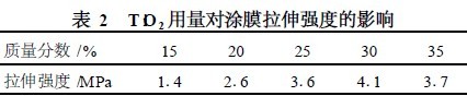 由表2可见,随着TiO2用量增加,涂膜拉伸强度增加,当其质量分数超过30%时,拉伸强度有所下降。另外, TiO2含量太大,会使体系粘度过高而影响涂布性和稳定性,因此选取TiO2最佳质量分数为25%。