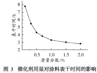 图3表明,质量分数控制在0.3% ~1.0%之内效果较好,既保证了涂料合成过程的反应速度,又保证了合适的干燥时间,超过1.0%使其固化太快而造成涂膜中产生大量气泡,并大大缩短贮存期。