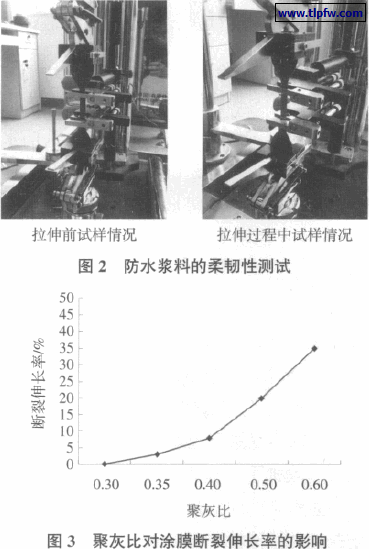 建筑物在投入使用后会产生一定程度的沉降和振动,因此,防水材料应该具有一定的柔韧性以抵御建筑物的变形。本文采用了聚合物水泥类防水材料常用的断裂伸长率对防水浆料的柔韧性进行表征,测试方法和结果分别如图2、图3 所示。