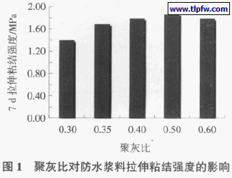 聚灰比对防水浆料拉伸粘结强度的影响见图1。