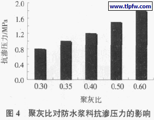 在家装领域的防水工程中,一般为防水层的迎水面承受水的作用。本文考察了聚灰比对防水浆料迎水面抗渗压力的影响,试验结果如图4 所示。