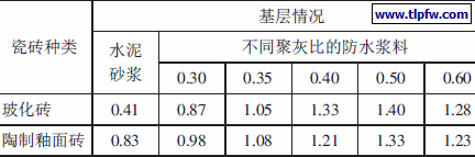 在家装领域,一般情况下是防水工程完成之后要与面层的瓷砖体系相结合,形成“防水层-瓷砖层”系统。为了保证整个系统的使用性能,防水层外要做一道保护层或对界面进行处理以保证瓷砖层的附着力,这样无形中增加了工程成本。为了考察瓷砖粘结砂浆直接与防水浆料的结合情况,本文对防水浆料防水层与瓷砖层的拉伸粘结强度进行了测试,测试采用的瓷砖粘结砂浆的配比为水泥∶砂(40~120 目)∶水=1∶1.5∶0.36,瓷砖采用常用的玻化砖和陶制釉面砖,制样方法为背粘法;防水浆料基层养护龄期为7 d。试验结果见表1。