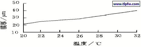 ( 6) 温度 HED-I 型厚膜阴极电泳涂料槽液的使用温度为28±2 ℃。温度对电泳的性能、槽液的稳定性均有较大的影响。温度与膜厚的关系见图2, 由此可知当槽液的温度控制在规定的工艺范围内时, 能获得稳定膜厚和均匀光滑的涂层。