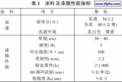 HED-I 型厚膜阴极电泳涂料是以胺改性环氧树脂、封闭型异氰酸酯固化剂为主要成膜基料, 配以各种分散剂、流平剂、助溶剂等, 由乳液和色浆组成。涂料指标及漆膜性能见表1。