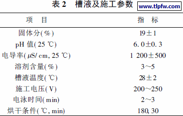 HED-I 型厚膜阴极电泳涂料的槽液及施工参数见表2。