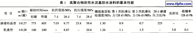 材料种类不尽相同,其性能特点也因材而异。只有全面了解材料的特性指标,才能合理选材。防水材料的优劣判断标准包括:弹性伸长率、透水性、抗压和抗裂强度、抗老化性等。还包括其与基材的粘结性及其与表面饰材的粘结性。以下选取某品牌的该类防水涂料(渗透结晶型)和同品牌聚合物水泥防水涂料(乳液型)制成试样进行试验,结果见表1