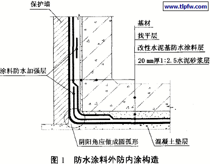 当涂料防水层是施工过程的中间工序时,其后续工序(如回填、钢筋绑扎等)均有可能损伤已做好的防水层,故在铺设刚性保护层之前不应在防水层上进行施工操作或堆放物品。待涂料完全固化后(2 3周),其上再做厚度为20 mm、1:2.5的水泥砂浆保护层,以发挥更好的保护作用。若防水施工为最后一道工序,该防水涂料亦可不设刚性保护层。