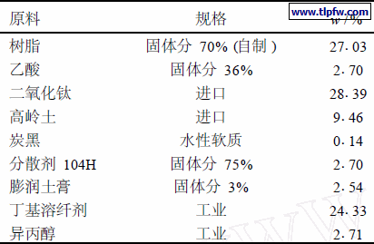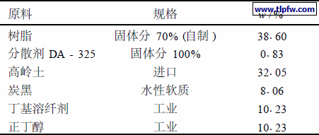 炭黑为疏水性无机颜料,经表面活性剂处理后变成亲水性,用于水性涂料。二氧化钛是经过处理后的金红石型产品,可减轻粉化程度,提高耐候性。高岭土选取吸油量适中的,使得光泽适中,并可防止颜料沉降。