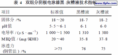 将槽液在搅拌的状态下熟化48 h,检测双组分阴极电泳漆黑/灰槽液技术指标,结果见表4。
