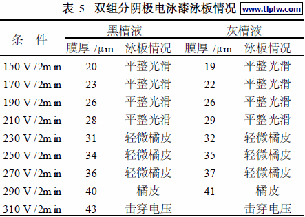 双组分阴极电泳漆黑槽液及灰槽液泳板情况见表5。