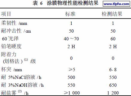 用电泳好的样板(黑板膜厚26 μm、灰板膜厚28μm左右)进行物理性能检测,结果如表6。