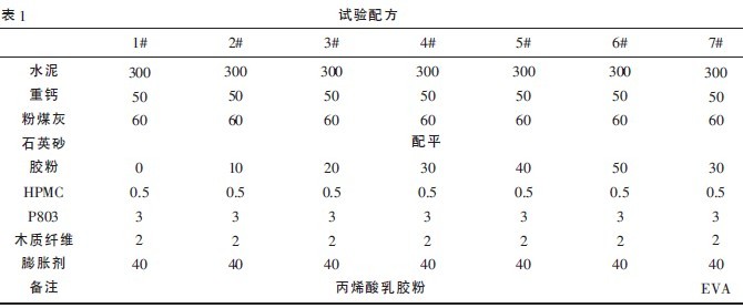 试验配方如表1 所示, 其中1#~6# 配方中胶粉为6041A 丙烯酸乳胶粉,胶粉掺量分别为0~5%;7# 配方中胶粉为EVA 胶粉,胶粉掺量为3%。