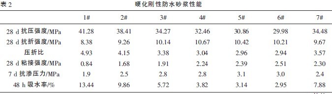 刚性聚合物防水砂浆的养护方法、抗压、抗折、压折比、粘接强度、抗渗性和收缩率测试按照《聚合物水泥防水砂浆》(JC/T984-2005)进行;吸水率按照《聚合物改性水泥砂浆试验规程》进行, 成型40 mm×40 mm×160 mm 三联模,在20±3 ℃,50±5%相对湿度的环境下养护至28 d 龄期后,在80 ℃干燥48 h 后进行浸水试验,测量其48 h 吸水率。